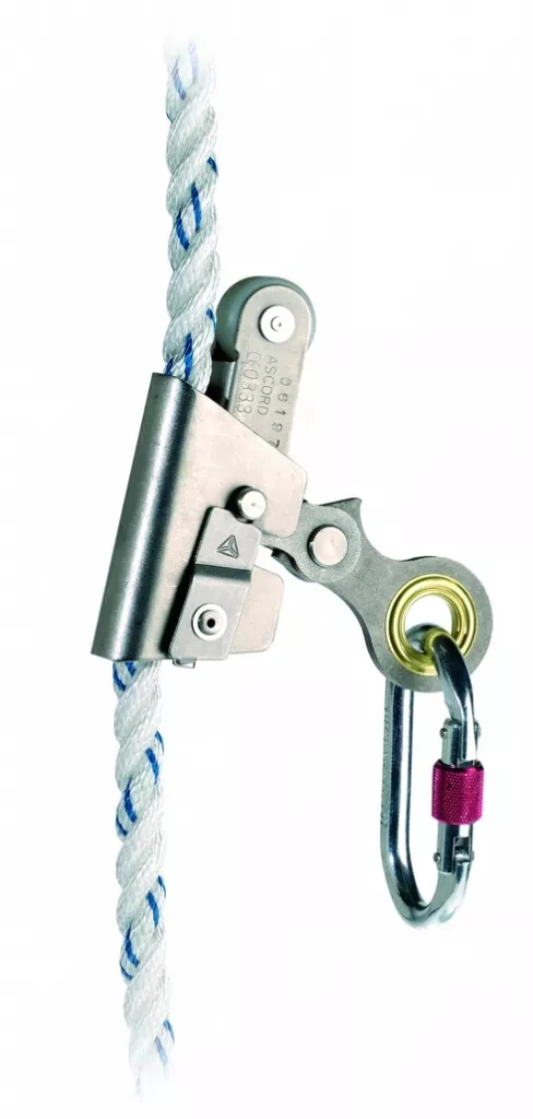 Acier inoxydable. Antichute coulissant sur support dassurage de type ouvrant avec verrouillage automatique comprenant un dissipateur dénergie, un détrompeur de sens incorporé et un connecteur à vis.
