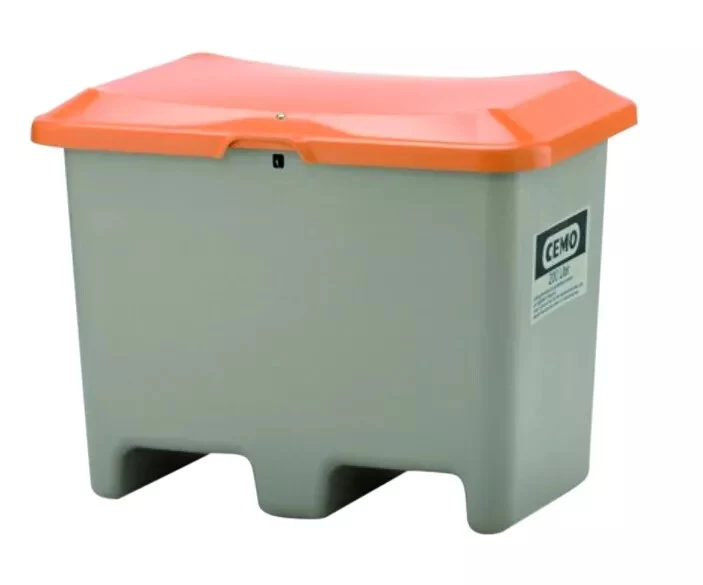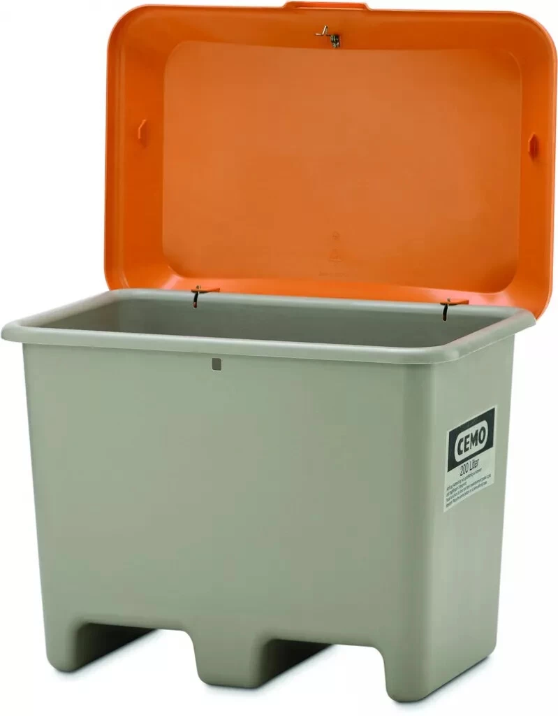 Polyester, acier inox. Contenance 200 L. Ouverture couvercle 100° : accès facile au contenu. Produits admissibles : sables, sel, granulats, absorbant. Sans ouverture d’écoulement. Température d’utilisation : -20°C à +40°C.
