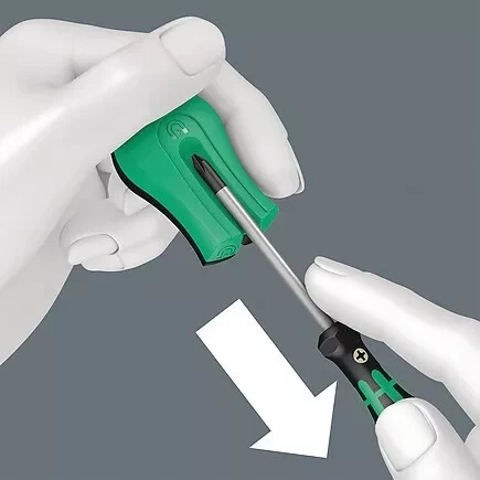 Permet d’aimanter/désaimanter les outils et d’assurer ainsi le parfait maintien des vis sur la lame. Pour magnétiser l’extrémité de la lame, glisser l’outil le long de la face positive du bloc. Pour démagnétiser l’outil, le faire passer le long du pôle négatif.