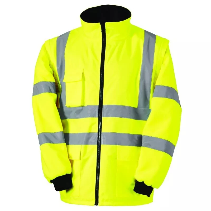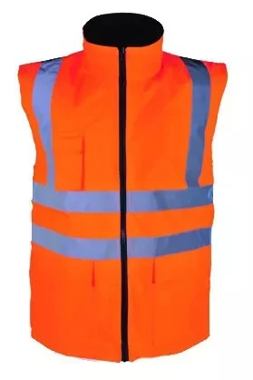 Blouson/gilet de signalisation col montant avec bandes grises rétro-réfléchissantes et fermeture à glissière. Poches intérieures et extérieures. Repose-mains. Manches en polaire avec poignet tricot.