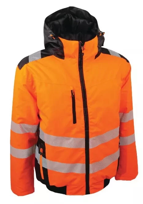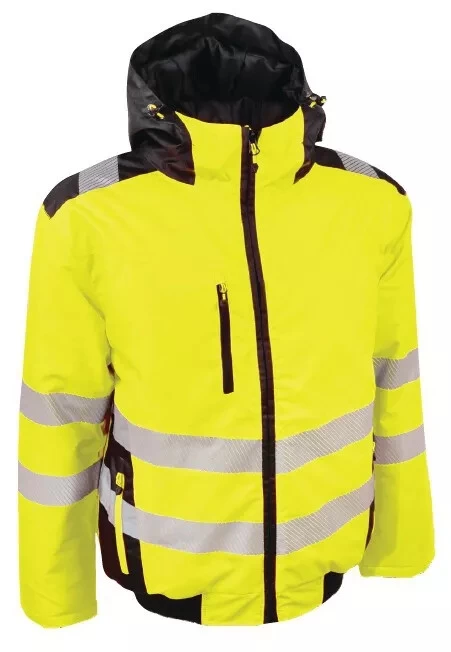 Blouson léger à capuche fixe avec cordon de serrage et fermeture à glissière. Bandes rétro-réfléchissantes segmentées pour une visibilité optimale de jour comme de nuit. 3 poches extérieures zippées et 1 poche intérieure. Taille et poignets bord-côtes. Certifié OEKO-TEX®.