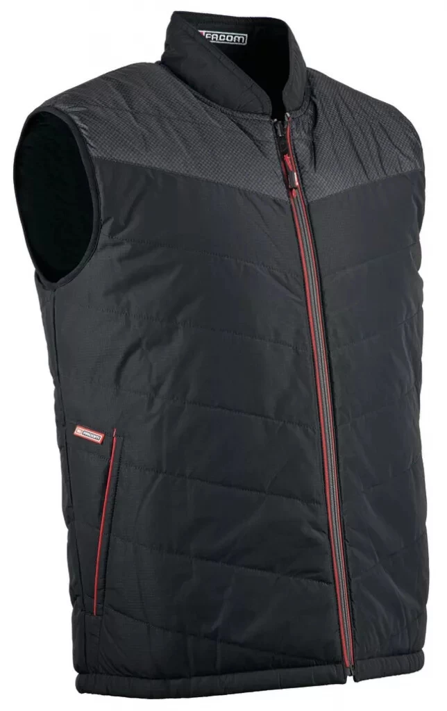 Gilet à empiècements contrastants devant et dos, fermé par zip nylon bicolore. Col forme baseball avec emmanchures finitions biais élastiqué. 2 poches latérales, passepoils rétroréfléchissants sur face 1 et rouges sur face 2.