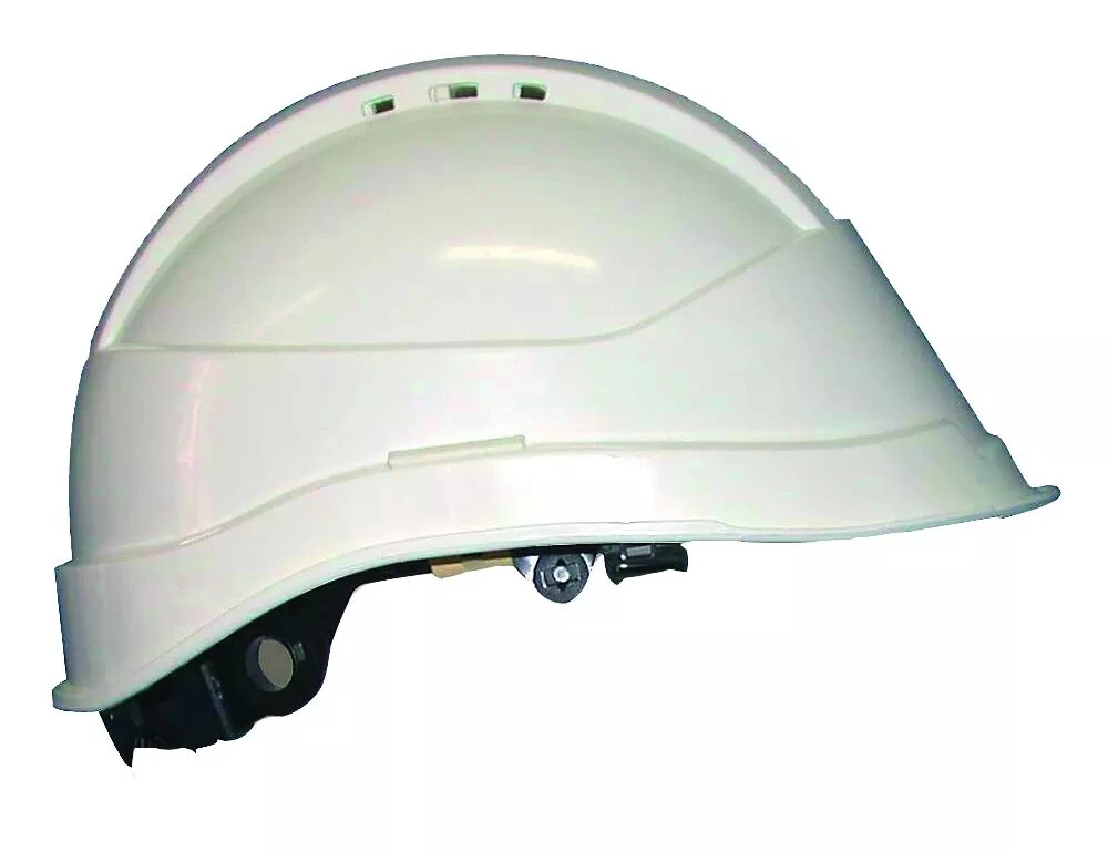 Calotte moulée sous pression en ABS. Bandeau de tour de tête en polyéthylène basse densité avec serre-nuque à crémaillère auto-bloquante, amovible et réglable de 49 à 63 cm.