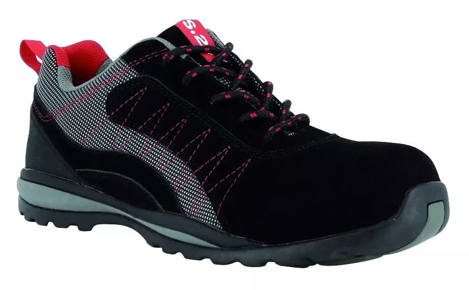 Dessus cuir croûte velours noire / toile grise. Embout composite.