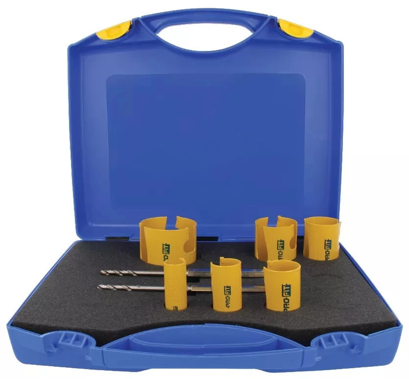 Coffret universel tous matériaux (bois durs/tendres/plaqués/exotiques, briques, plaques de plâtre, béton cellulaire, PVC, plexiglas…). Dents au carbure. Perçage ø 22 à 68 mm. Le système Click & Drill permet l’éjection facile de la carotte et des perçages plus grands grâce au double montage de scies sur l’axe.