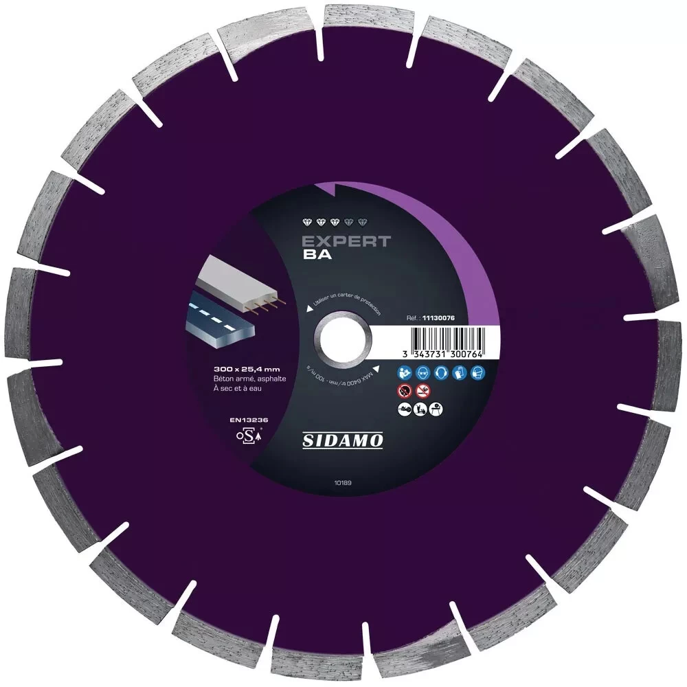 Disque à segments soudés laser. Adapté à la coupe à sec et à eau, avec trou dentraînement. Segments spécifiques et plus hauts pour la protection contre lusure dans lasphalte. Livré avec bague de réduction 25,4/20 mm.