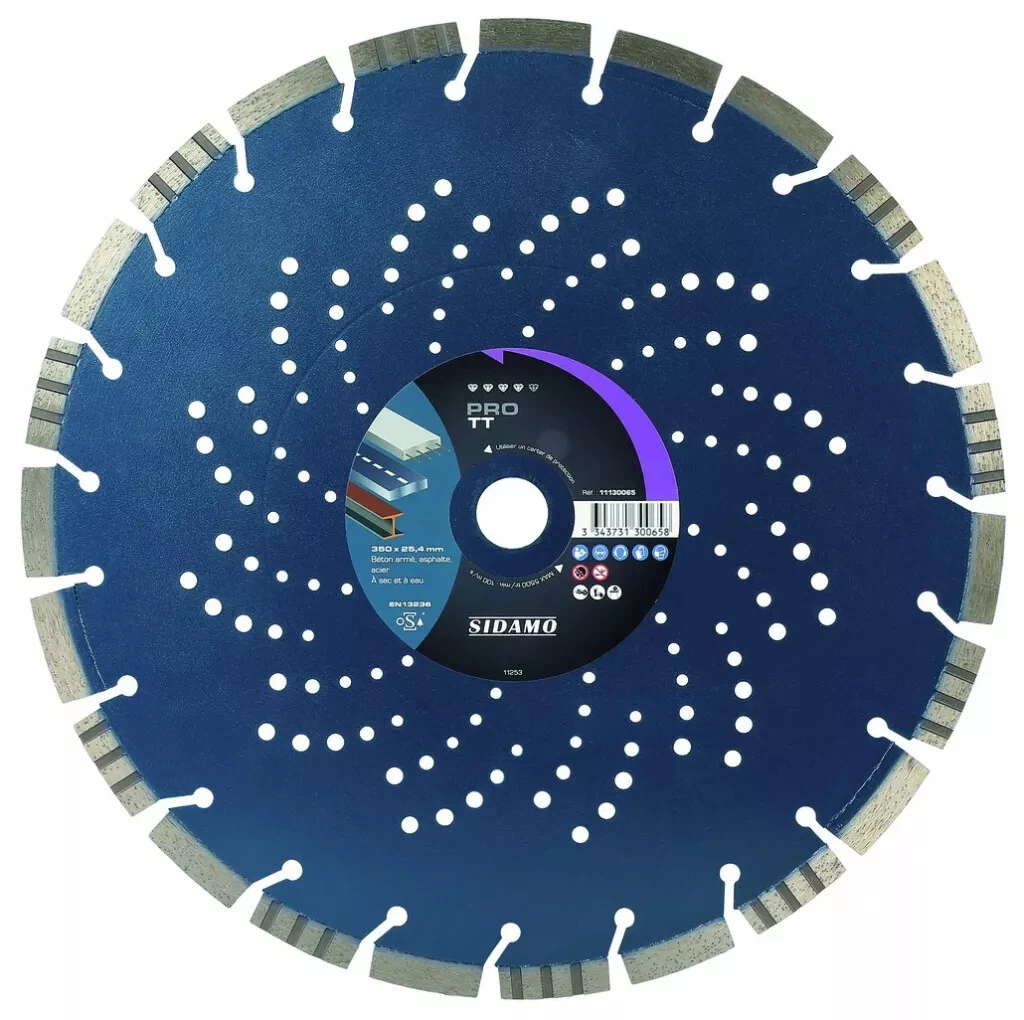 Disque à segments soudés laser. Adapté à la coupe à sec et à eau, avec trou dentraînement. Performances optimisées pour une utilisation mixte dans le béton, lasphalte et lacier. Centre acier perforé pour un meilleur refroidissement. Segments spécifiques et plus hauts pour la protection contre lusure dans lasphalte.