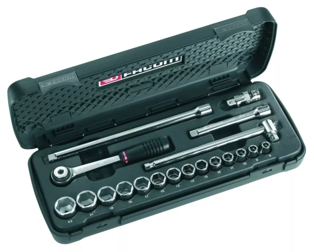 Douilles 12 pans (8 – 9 – 10 – 11 – 12 – 13 – 14 – 15 – 16 – 17 – 18 – 19 – 21 et 22 mm), cliquet, cardan, rallonges (125 mm – 250 mm),