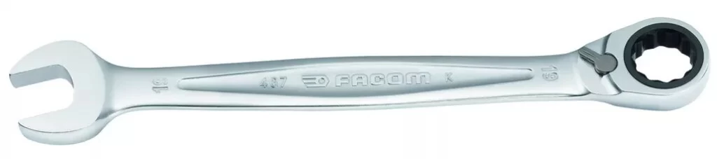 Système à cliquet réversible dans une tête oeil compacte. Clé coudée à 15°.