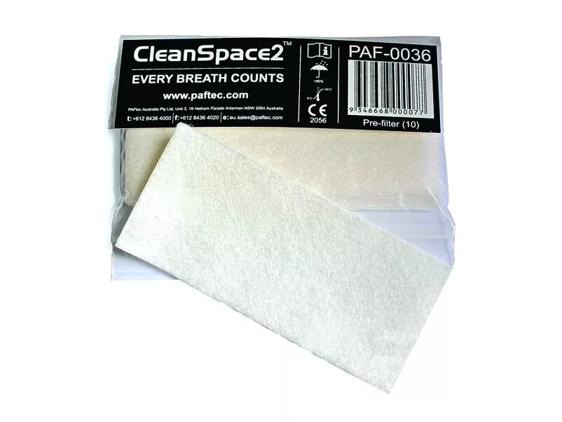 Le pré-filtre CleanSpace en filbres polymères filées élimine les particules et prolonge la durée de vie du filtre à particule. Il doit être changé après chaque utilisation. Température de stockage et d’utilisation : -10°C à +55°C. A n’utiliser qu’avec les filtres CleanSpace.