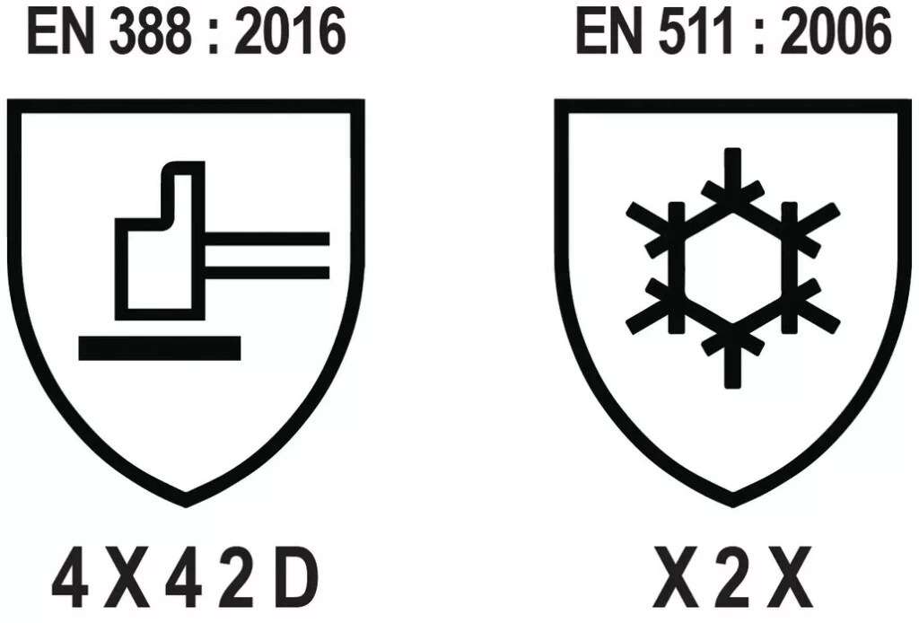 Normes : EN 388:2016 4X42D, EN 420:2003+A1 2009, EN 511:2006 X2X.