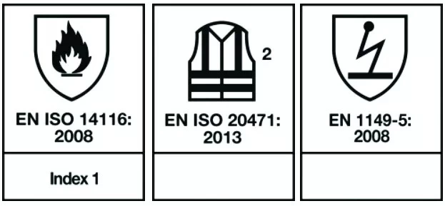 Normes : EN ISO 14116 Index 1, EN 1149-5, RIS 3279 – TOM ISSUE 1 (orange seulement), EN ISO 20471 Classe 2.