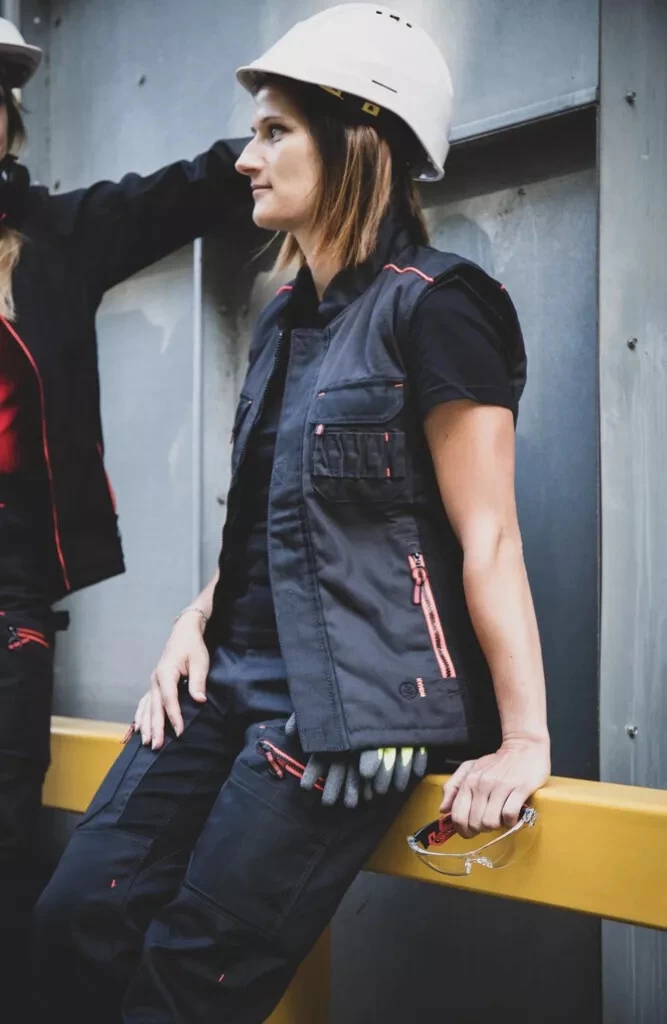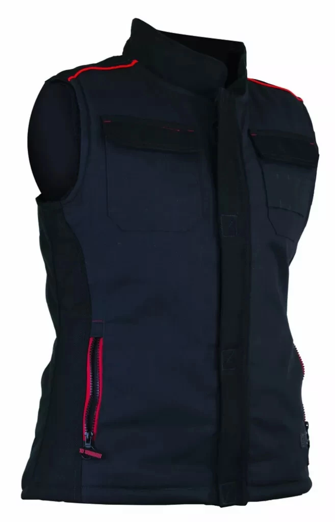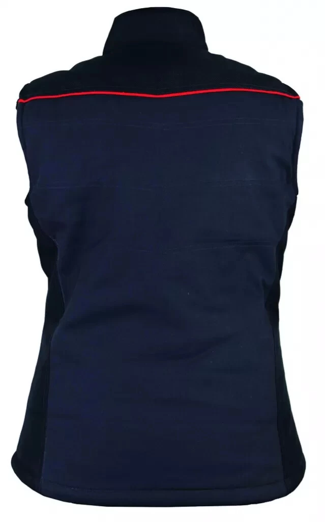 Gilet matelassé à col montant, passepoils épaules et dos contrastants fluo. 2 poches poitrine avec rabat et auto-agrippant + emplacements stylos. 2 poches basses zips contrastants, dos rallongé, points darrêt contrastants, empiècements en OXFORD 900D imperméable, emmanchures élastiquées, empiècements cotés extensibles, doublure ouatinée.