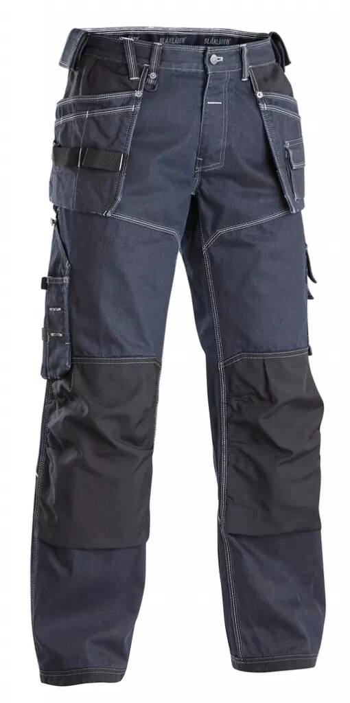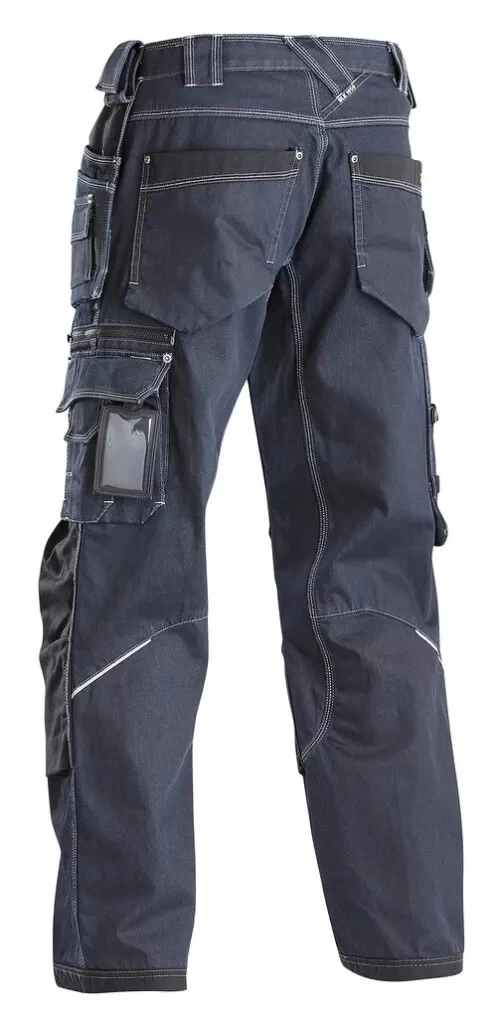 Lavage industriel. Genoux préformés. Poches à clous, poches arrière, poche mètre, poches jambe, poches genouillères et bas de cheville renforcés en Cordura®.