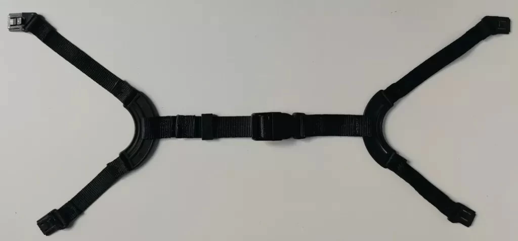 Tissu synthétique avec mentonnière, attache scratch et attache boucle flash.