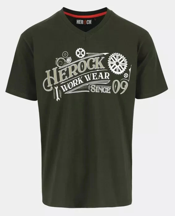 Tee-shirt Barber : imprimé HEROCK® blanc/kaki sur fond kaki, col V, 100% jersey pré-rétréci, 190g/m².