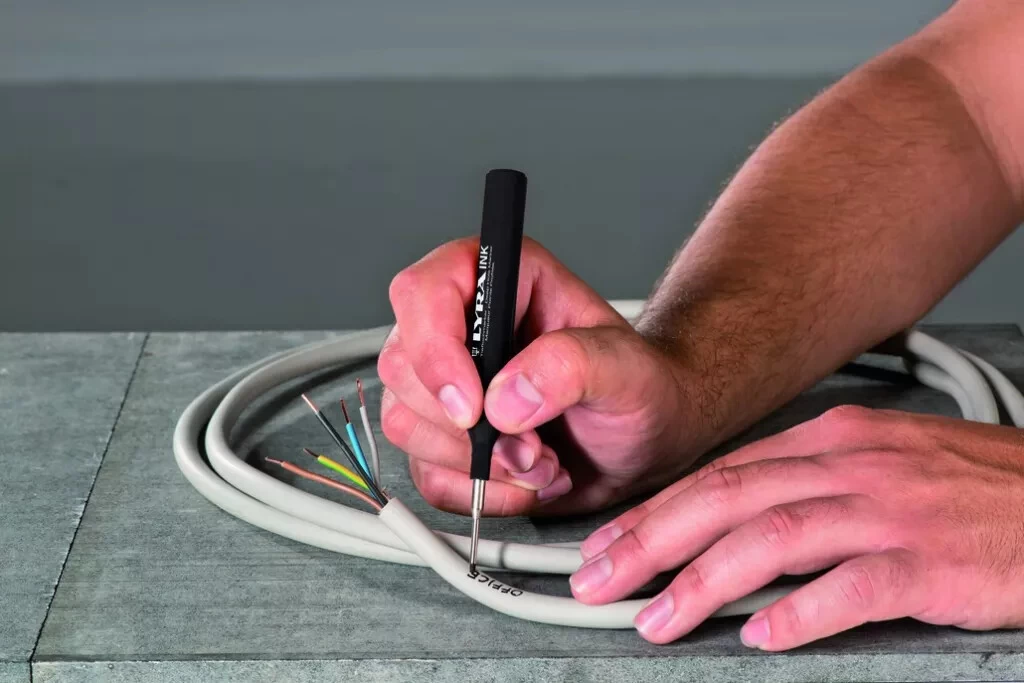 Encre permanente tenant Ă lÂeau : effaçable avec de lÂalcool ou essence de tĂ©rĂ©benthine. Pointe Ăž 1,5 mm. Longueur 150 mm.