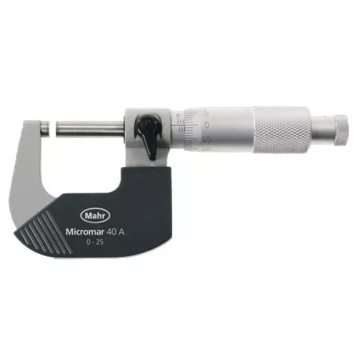 Micromètre avec étrier en acier laqué, doté de plaques isolantes et d’un dispositif de blocage.