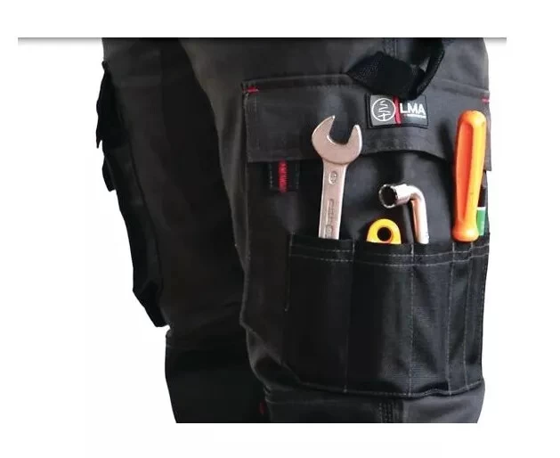 Renfort entrejambe devant et dos. Ceinture élastiquée réglable sur les côtés, réhaussée dos pour les lombaires. Côté gauche : passant porte marteau, 1 poche cuisse à soufflet avec poche à outils. Côté droit : 1 poche cuisse à soufflet, 1 poche téléphone. Dos : 2 poches fermées par bandes auto agrippantes, dont une à rabat, 1 poche mètre et 1 poche à stylo.