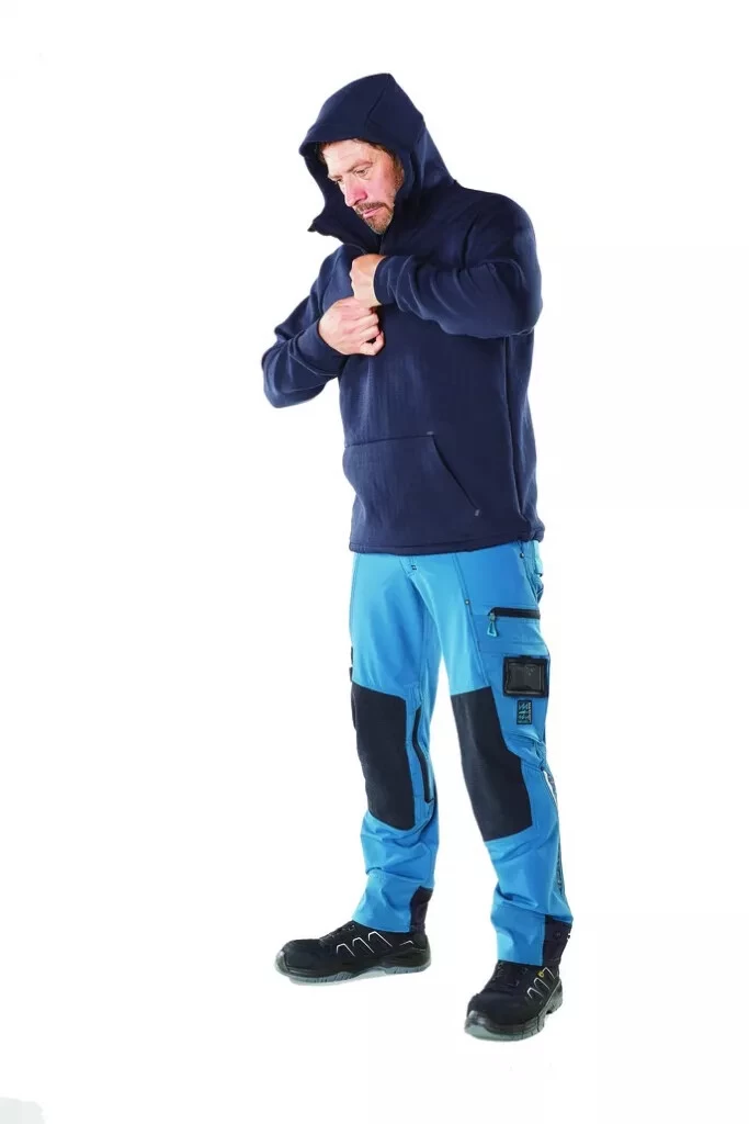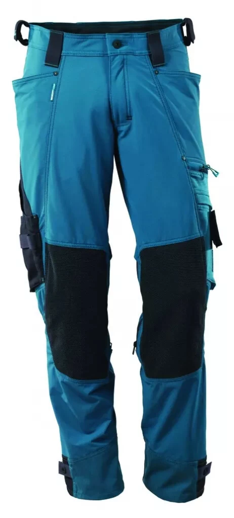 Poches arrière. Patte-outils de chaque côté de la taille. Poche cuisse incluant une poche téléphone à fermeture aimantée et un porte badge. Porte-badge amovible.