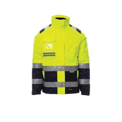 Parka haute-visibilité bicolore, avec bandes 3M et capuche repliable dans le col.