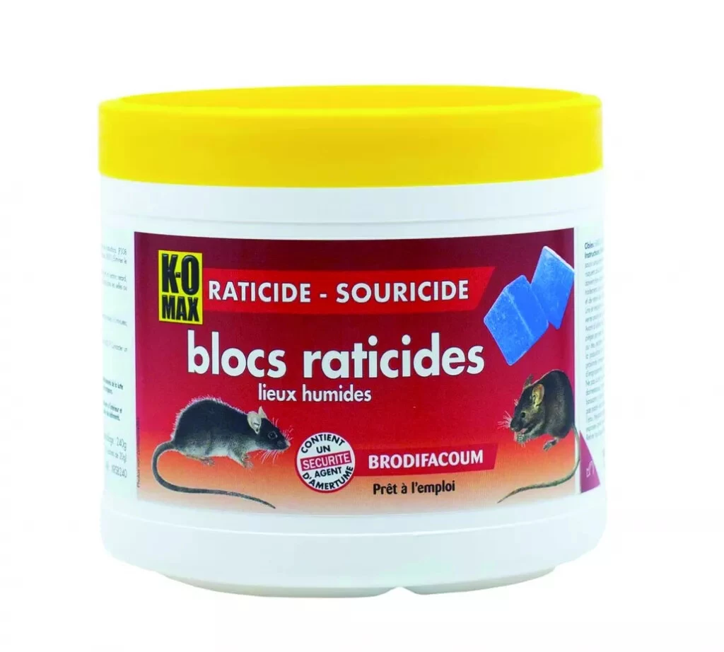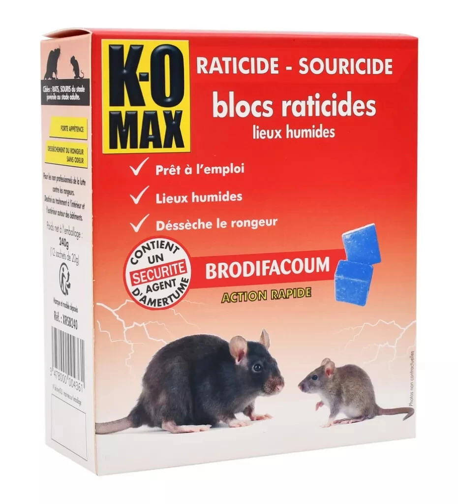 K-OMAX RATICIDE SOURICIDE BLOC est très efficace contre les rongeurs résistant aux anticoagulants classiques. Agit avec un effet retard et néveille pas la méfiance des rongeurs qui saffaiblissent et meurent en quelques jours. La matière active participe au dessèchement du rongeur et évite ainsi les fortes odeurs de putréfaction.