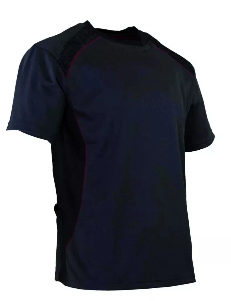 Empiècements épaules motif rétro-réfléchissant. Col rond sport avec bande de propreté et demi lune contrastante. Découpes et surpiqûres flatlock contrastantes. Poche téléphone au dos dans la découpe. Broderie LMA.