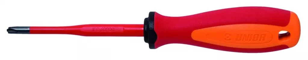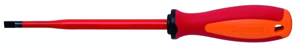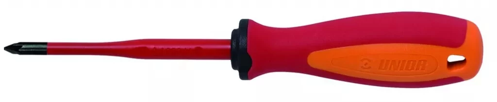 Lame : chrome vanadium acier molybdène. Extrémité brunie. Poignée ergonomique TBI. Manche trimatière. Trou pour suspension sur crochet. Conçu selon la Norme EN60900. Isolation VDE GS 1000 V.