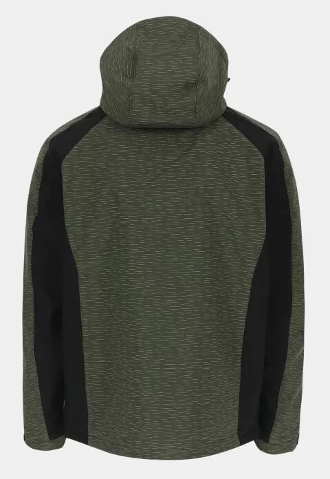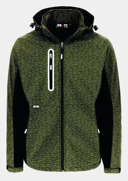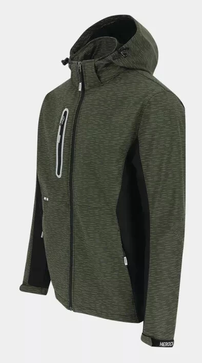 Veste coupe-vent imperméable et respirante en softshell 3 couches à capuche détachable et poignets réglables. Resserrable en bas par cordon élastique. Impression et détails réfléchissants. Multipoches dont 1 poche poitrine et 2 poches latérales.