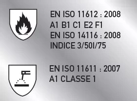 Normes EN ISO 11612 : 2008 A1 B1 C1 E2 F1 , EN ISO 11611 : 2007 A1 Classe 1.