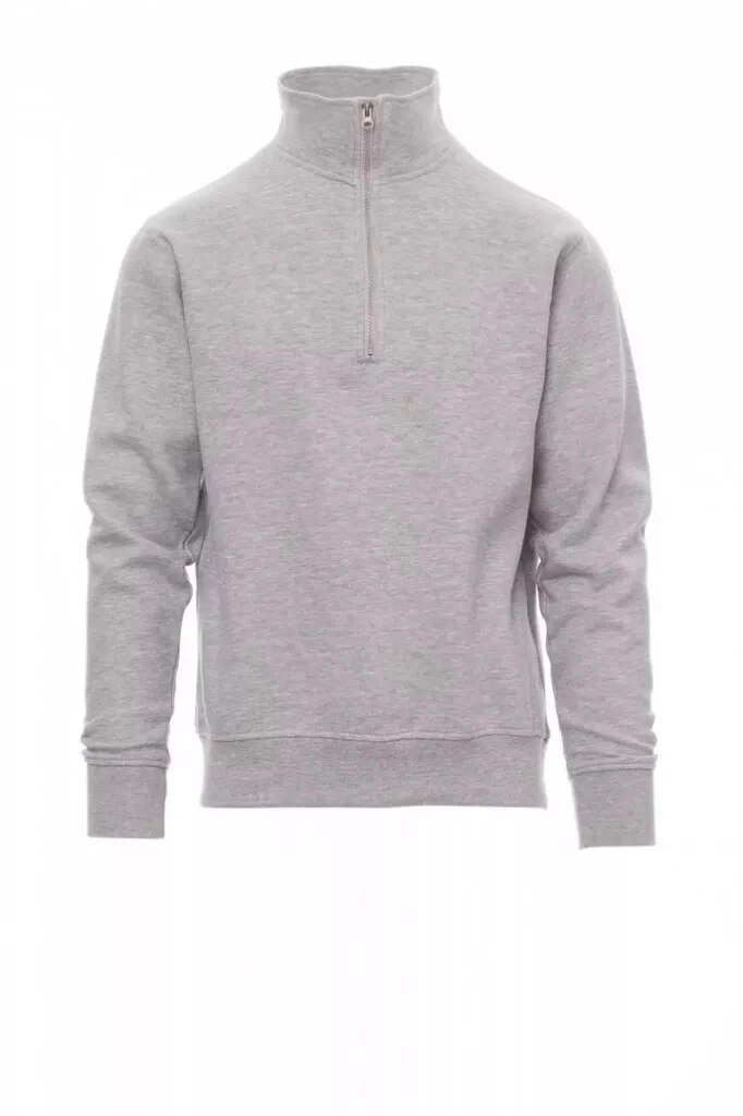 Sweat-shirt gris chiné pour homme à demi-fermeture éclair assortie, en plastique avec curseur en métal, manches montées, poignets et taille en bord à côtes élastifié, coutures renforcées.