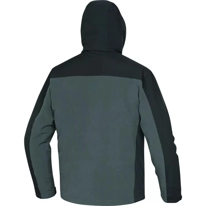 Veste softshell, fermeture par zip antifroid. Capuche fixe, 4 poches.