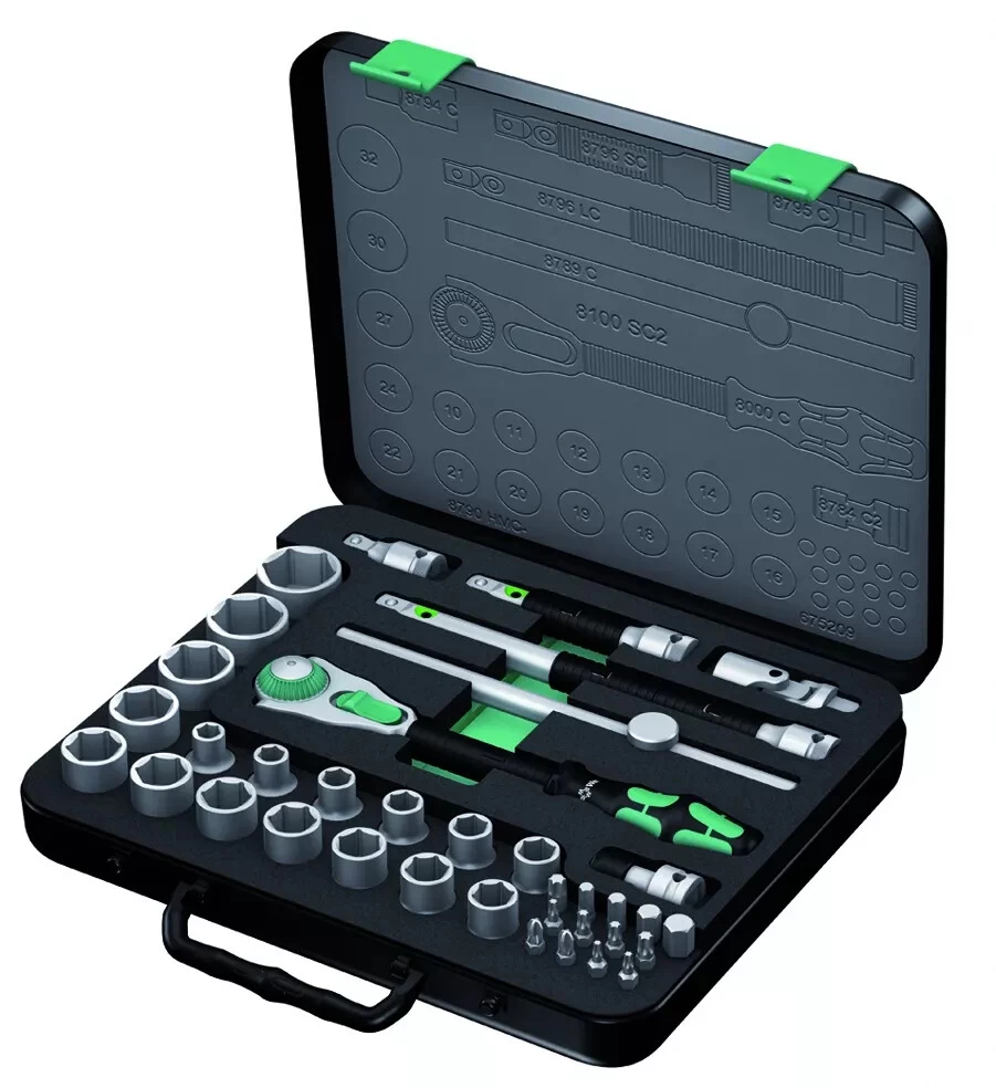 1 cliquet à emmanchement, 17 douilles (métrique), 2 rallonges « flexible-lock » (courte et longue) avec douille à rotation rapide, 1 manche en T, 1 rallonge Wobble, 1 joint de cardan, 1 adaptateur avec mandrin à serrage rapide et 13 embouts.